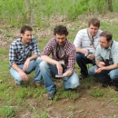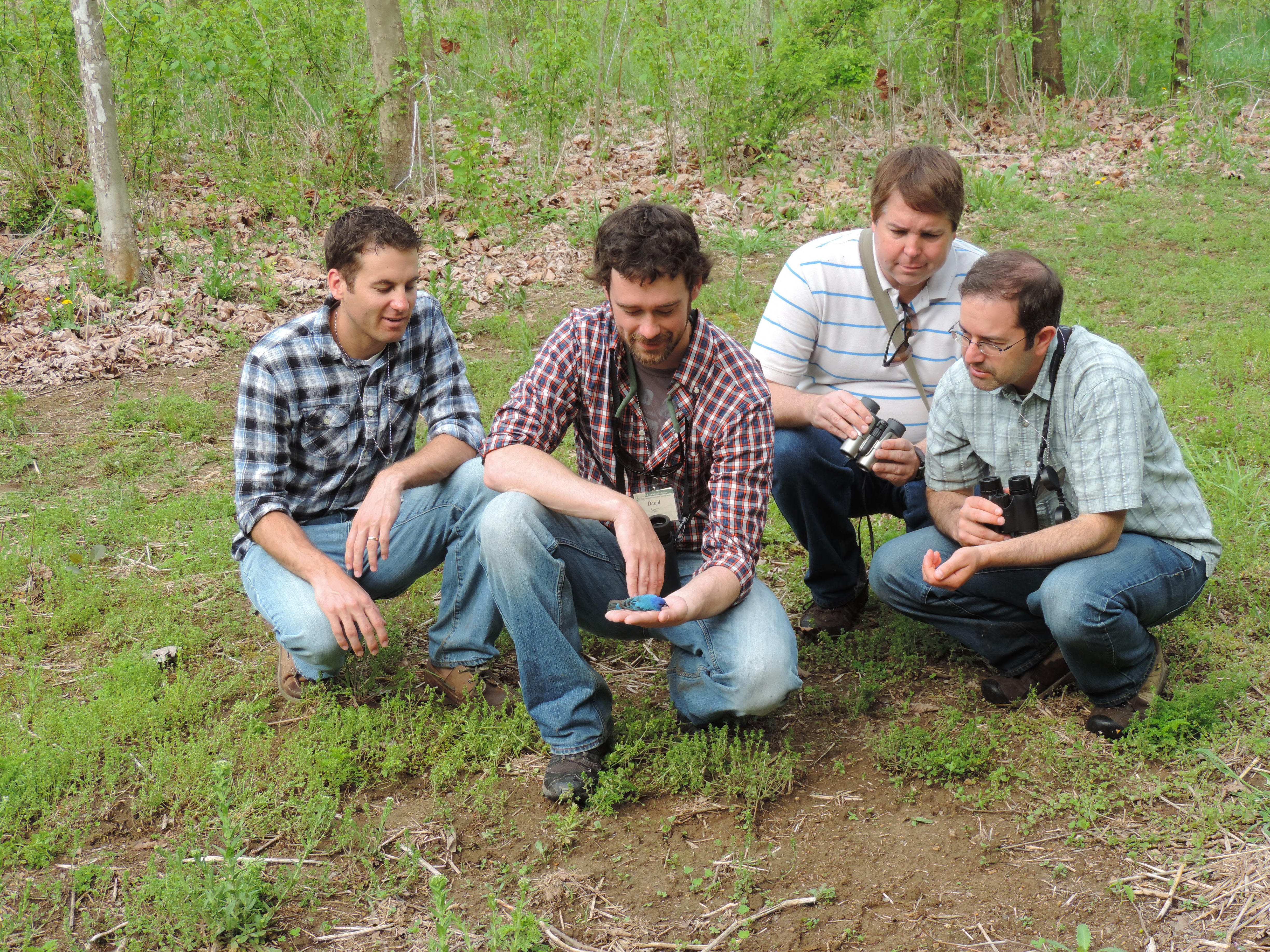 This shows a group of U.S. Fish and Wildlife Service employees preparing to release an Indigo Bunting during the Basic Bird Biology Class in Shepherdstown, WV. Bird was measured, weighed, banded and released.