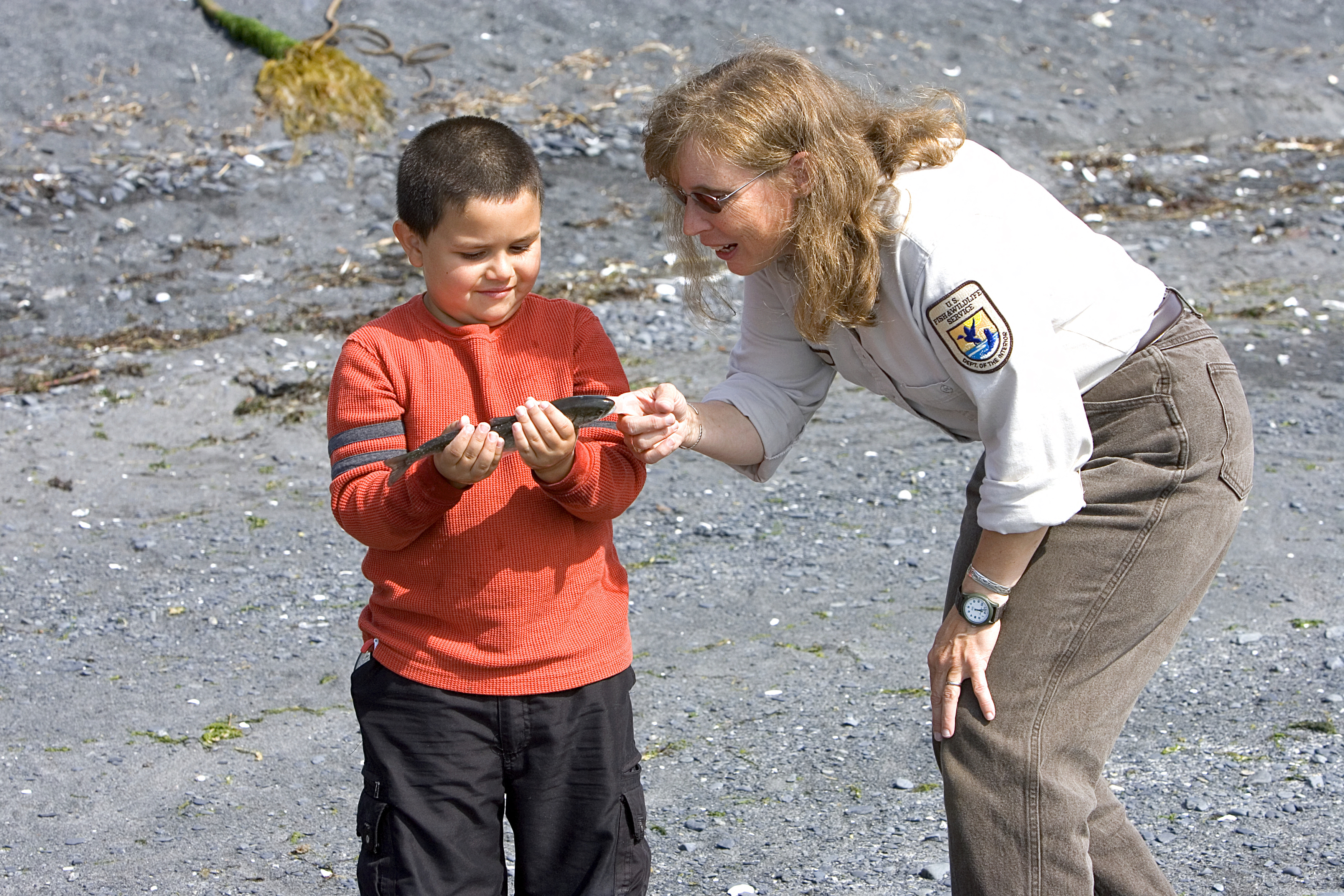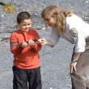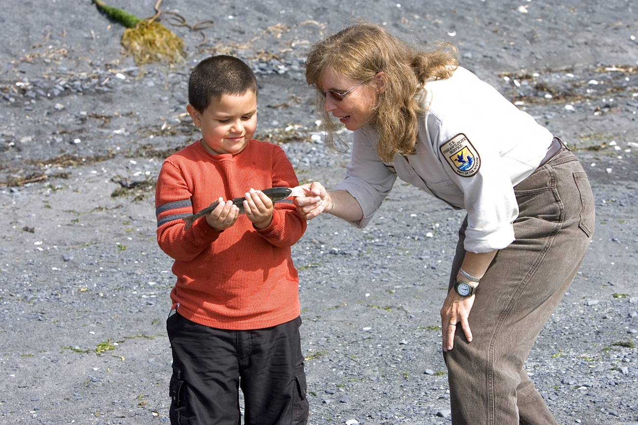 U.S. Fish and Wildlife Service employee talking with a child about fish. Today, the refuge has a global conservation role - to instill regard for bears, salmon, and other wildlife; to protect interdependent species of fish, wildlife and plants within the largest intact, pristine island ecosystem in North America; and to ensure compatible management of wildlife, subsistence, recreation, and economic uses of refuge resources. Misty fjords, deep glacial valleys, and lofty mountains distinguish the 1.9 million-acre refuge. Diverse habitats encompass 117 salmon-bearing streams, 16 lakes, riparian wetlands, grasslands, shrub lands, spruce forest, tundra, and alpine meadows. Collectively these habitats sustain 3,000 bears, account for up to 30 million salmon caught by the Kodiak-based fishing fleet, support more than 400 breeding pairs of bald eagles, and provide essential migration and breeding habitat for another 250 species of fish, birds and mammals. Such natural abundance and spectacular scenery attracts thousands of visitors to the refuge annually.
