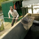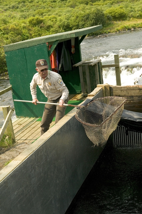 A U.S. Fish and Wildlife Service employee netting fish at Kodiak National Wildlife Refuge. Today, the refuge has a global conservation role - to instill regard for bears, salmon, and other wildlife; to protect interdependent species of fish, wildlife and plants within the largest intact, pristine island ecosystem in North America; and to ensure compatible management of wildlife, subsistence, recreation, and economic uses of refuge resources. Misty fjords, deep glacial valleys, and lofty mountains distinguish the 1.9 million-acre refuge. Diverse habitats encompass 117 salmon-bearing streams, 16 lakes, riparian wetlands, grasslands, shrub lands, spruce forest, tundra, and alpine meadows. Collectively these habitats sustain 3,000 bears, account for up to 30 million salmon caught by the Kodiak-based fishing fleet, support more than 400 breeding pairs of bald eagles, and provide essential migration and breeding habitat for another 250 species of fish, birds and mammals. Such natural abundance and spectacular scenery attracts thousands of visitors to the refuge annually.