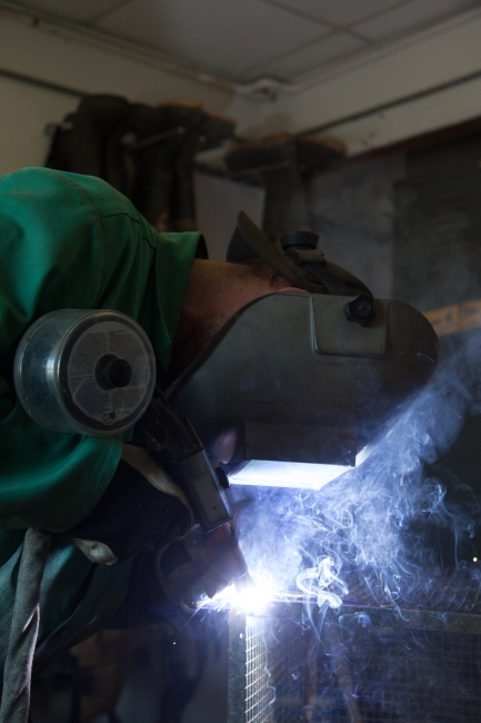 Service employee welds cages