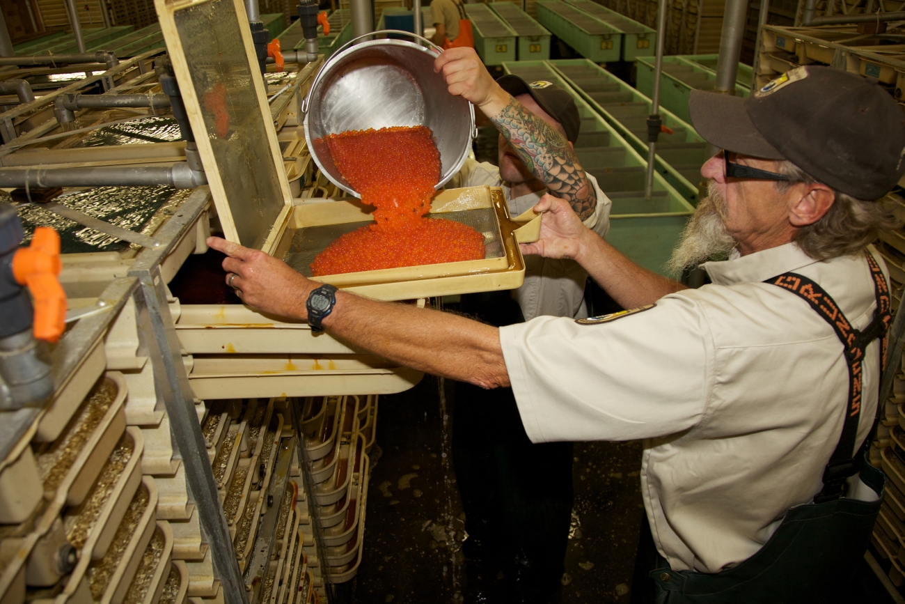 The eggs are removed from the females and placed in a container. Each female Chinook has between 4,000-5,000 eggs. Pacific Northwest Fisheries.