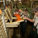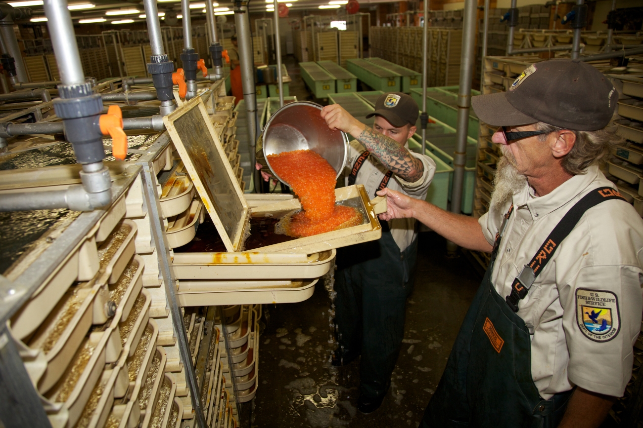 The eggs are removed from the females and placed in a container. Each female Chinook has between 4,000-5,000 eggs. Pacific Northwest Fisheries.