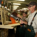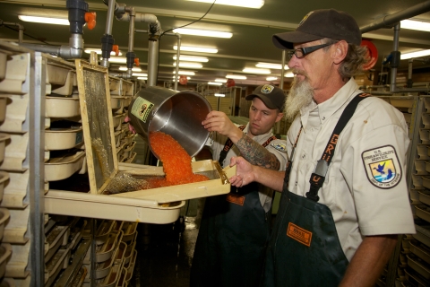 The eggs are removed from the females and placed in a container. Each female Chinook has between 4,000-5,000 eggs. Pacific Northwest Fisheries.