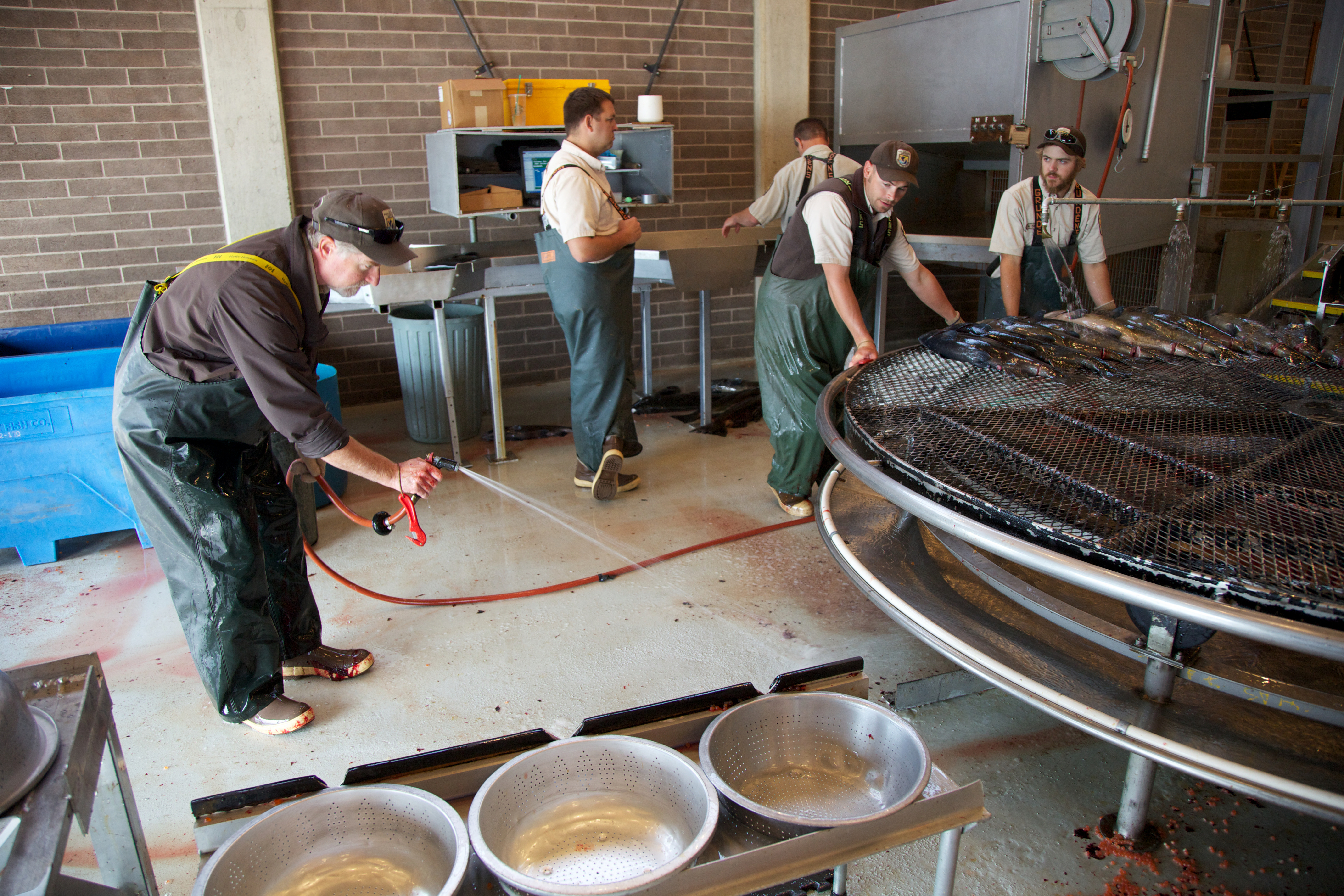 U.S. Fish and Wildlife Service employees at Spring Creek National Fish Hatchery, spawning facilities for Fall Chinook Salmon. Pacific Northwest Fisheries.