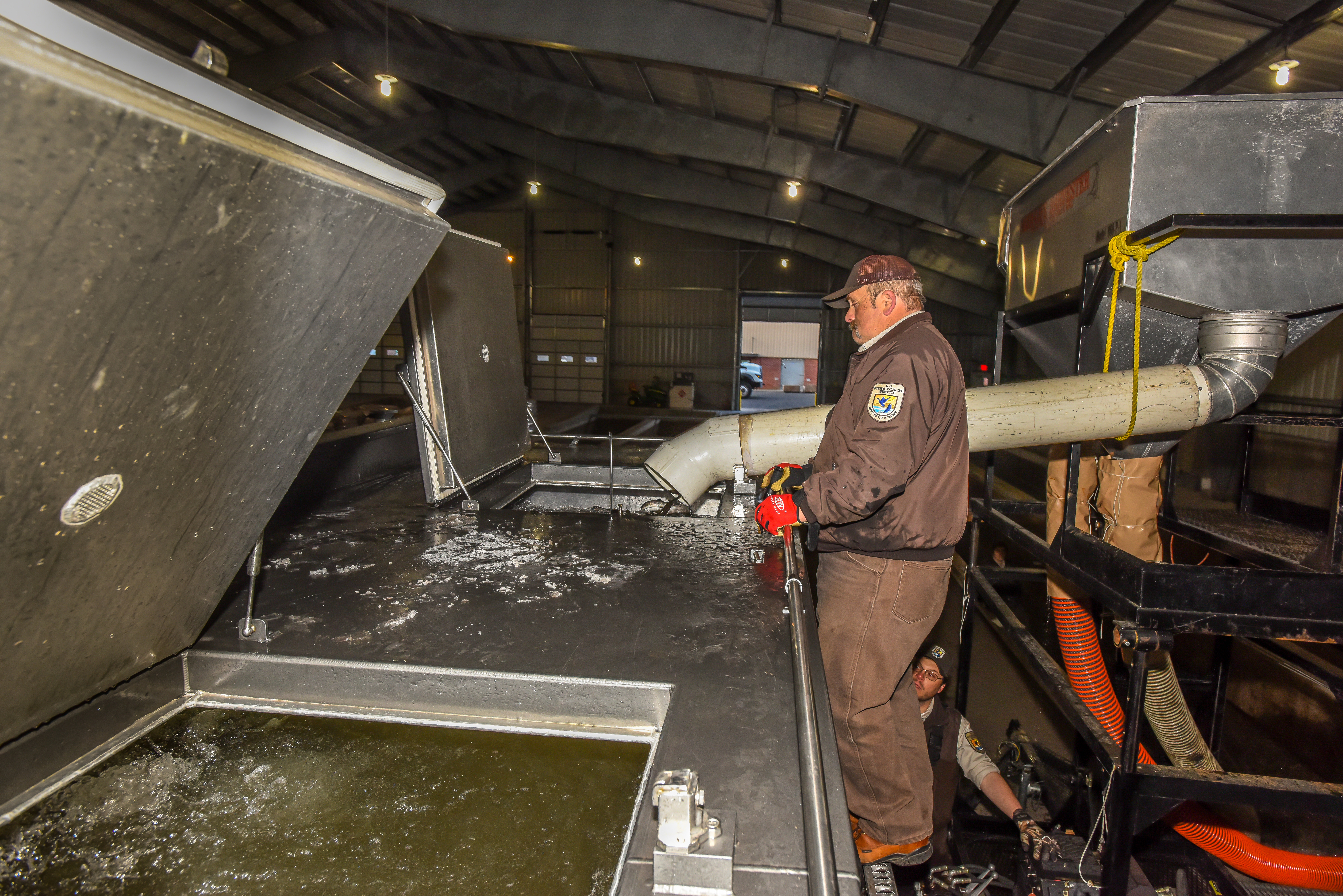 U.S. Fish and Wildlife Service (USFWS) employees at Pendills Creek National Fish Hatchery prepare fish pump to load fish onto hatchery.