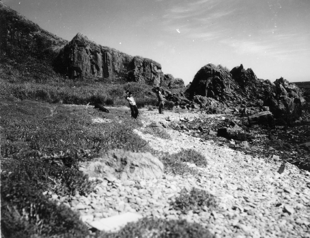 WW II Servicemen hiking in an unknown area of presumably Attu Island on a sunny day. This image was taken by Leo Halter, a serviceman stationed on Attu during WW II.