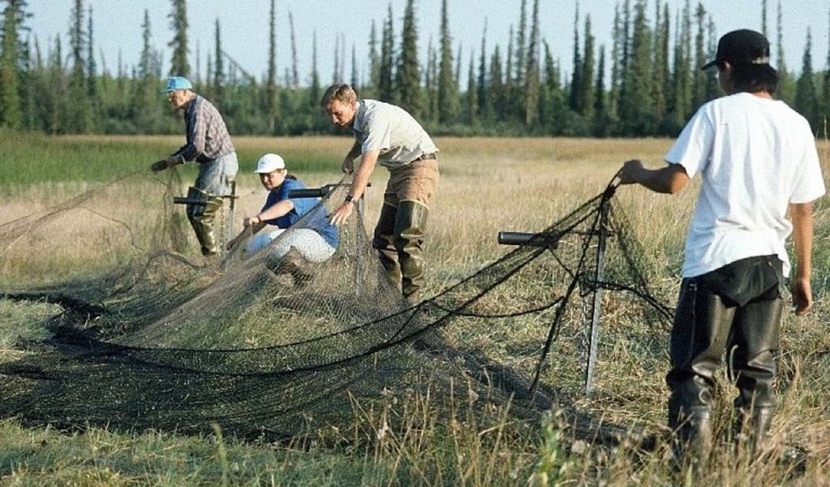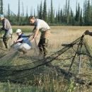 Researchers set up a waterfowl rocket net to capture and band ducks at Canvasback Lake, YFNWR. Animal Tagging; Bird banding; Habitat; Lakes; Wetlands; YFNWR; Species; Birds; Waterfowl