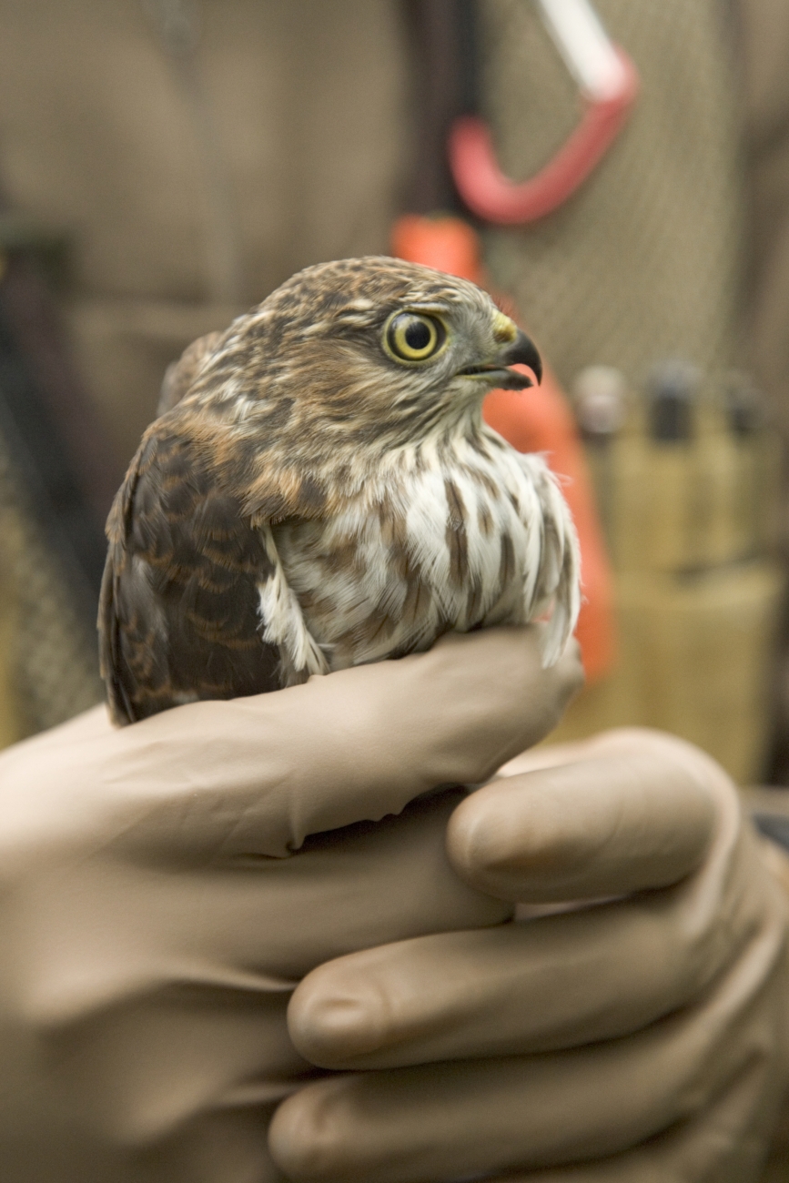Gloved hands hold a sharp-shinned hawk at Tetlin National Wildlife Refuge.