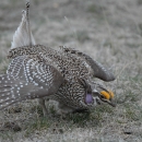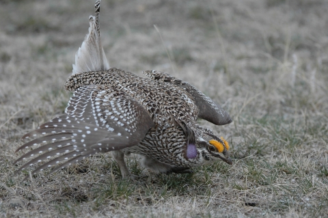 Male Sharp-tailed Grouse display to attract females on communal dancing grounds, called leks. The male provides no parental care. A female may visit a lek up to 10 or more times, and she may sample two different leks.