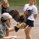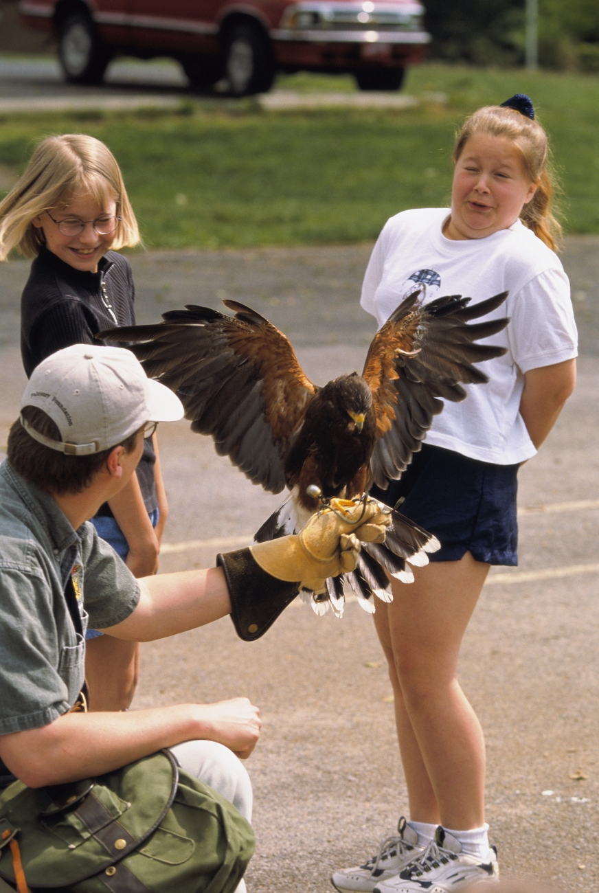 Two elementary school girls take a step back as a large bird spreads its wings before them at the Shepherdstown, Elementary School located in West Virginia.