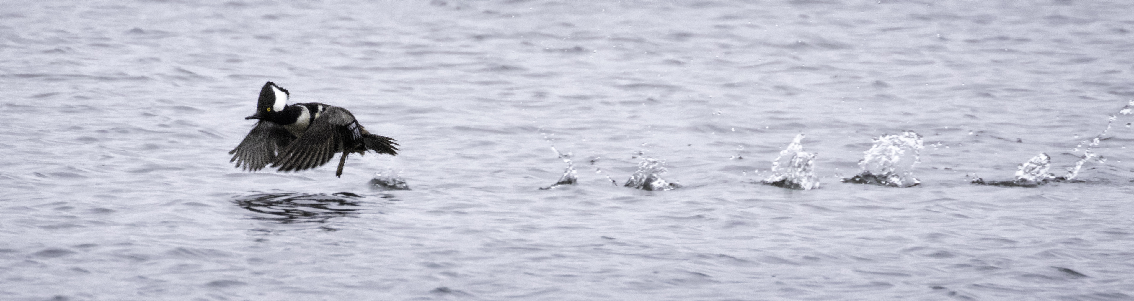 Male hooded merganser taking off.