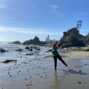 Pathways employee Angel Velasquez smiles and strikes a pose during her first time at Shi Shi beach in Washington.