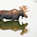 A Shiras Moose bull wades slowly across the Green River on a hot August afternoon. Largest cervid in the world. Long, dark brown hair. High, humped shoulders; long legs. Male has massive palmate antlers.