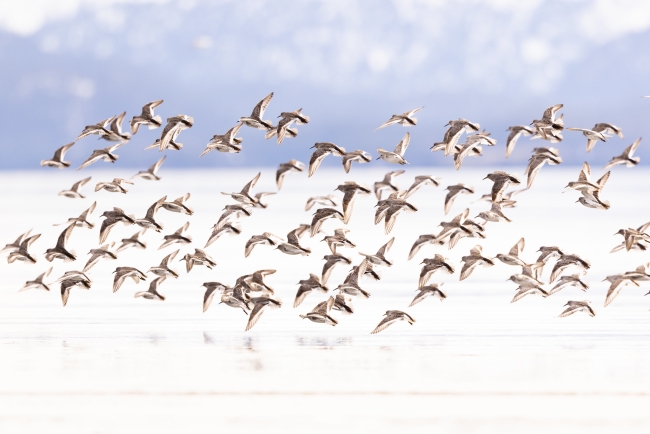 Shorebird flock in flight