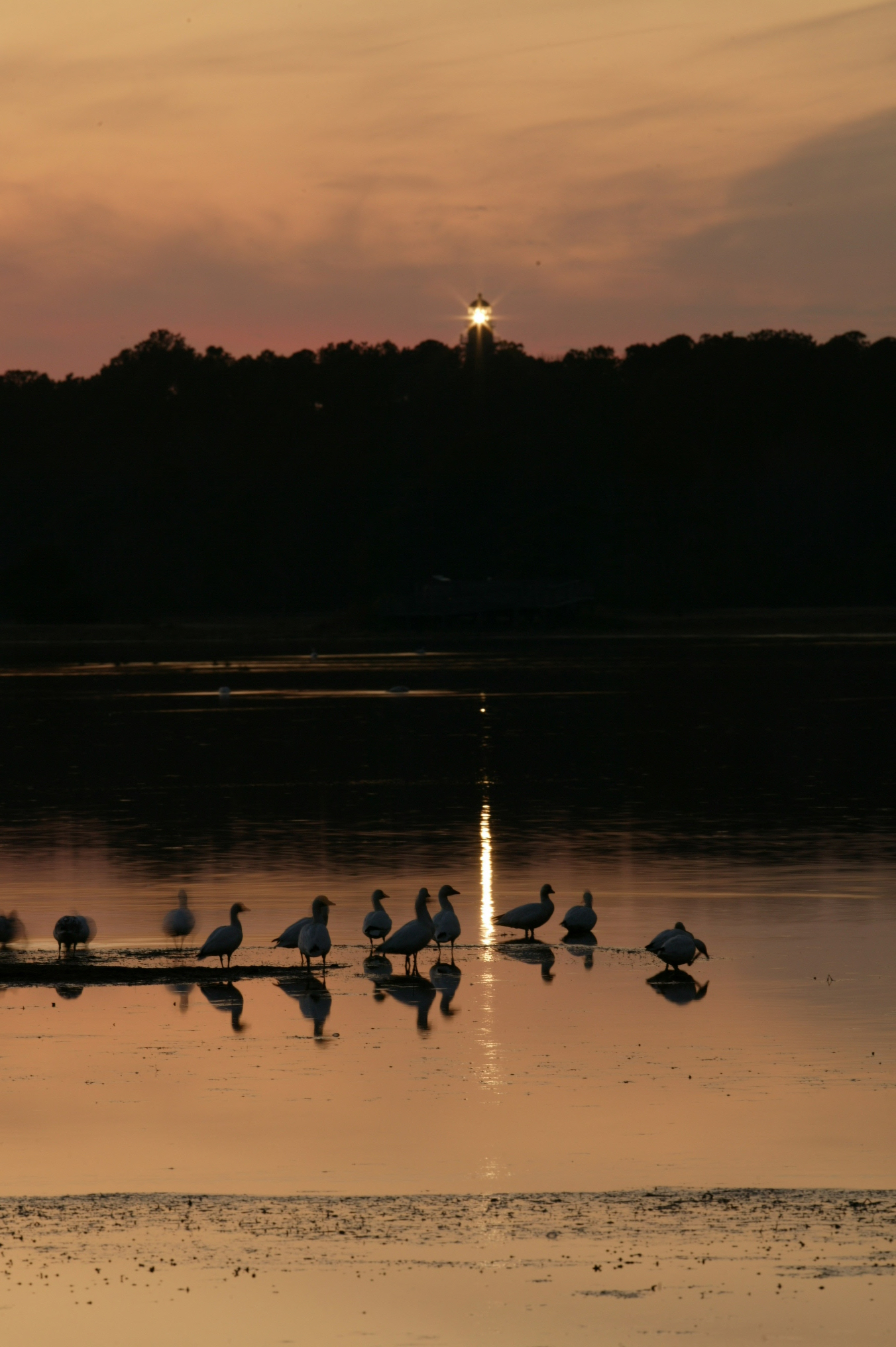 This is a picture of shorebirds at sunset with a beaming lighthouse in the background.