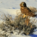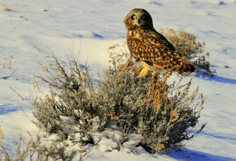 A short eared owl perches on a Wyoming big sagebrush, waiting for a sagebrush vole, cottontail rabbit, or other prey to show itself. A bird of open landscapes, the short-eared owl is one of the most widely distributed owls in the world. It is found across North America, South America, and Eurasia, and on many oceanic islands. It hunts day and night; mainly at dawn and dusk in winter. Flies low over open ground, locating prey by ear. Kills prey with a bite to the back of the skull; often swallows prey whole. Short-eared Owl populations declined by 2.5 percent per year between 1966 and 2010, resulting in a cumulative decline of 67 percent, according to the North American Breeding Bird Survey. Partners in Flight estimates a global breeding population of 3 million with 14 percent spending some part of the year in the U.S., 11 percent in Canada, and 3 percent wintering in Mexico. The 2014 State of the Birds Report listed them as a Common Bird in Steep Decline, and they rate a 12 out of 20 on the Partners in Flight Continental Concern Score. They are more common in the northern portion of their breeding range, but populations fluctuate greatly along with prey population cycles. While not rare on Seedskadee NWR, they are a pretty special sighting. A few may spend the winter here, or pause to rest and feed during migrations.