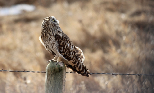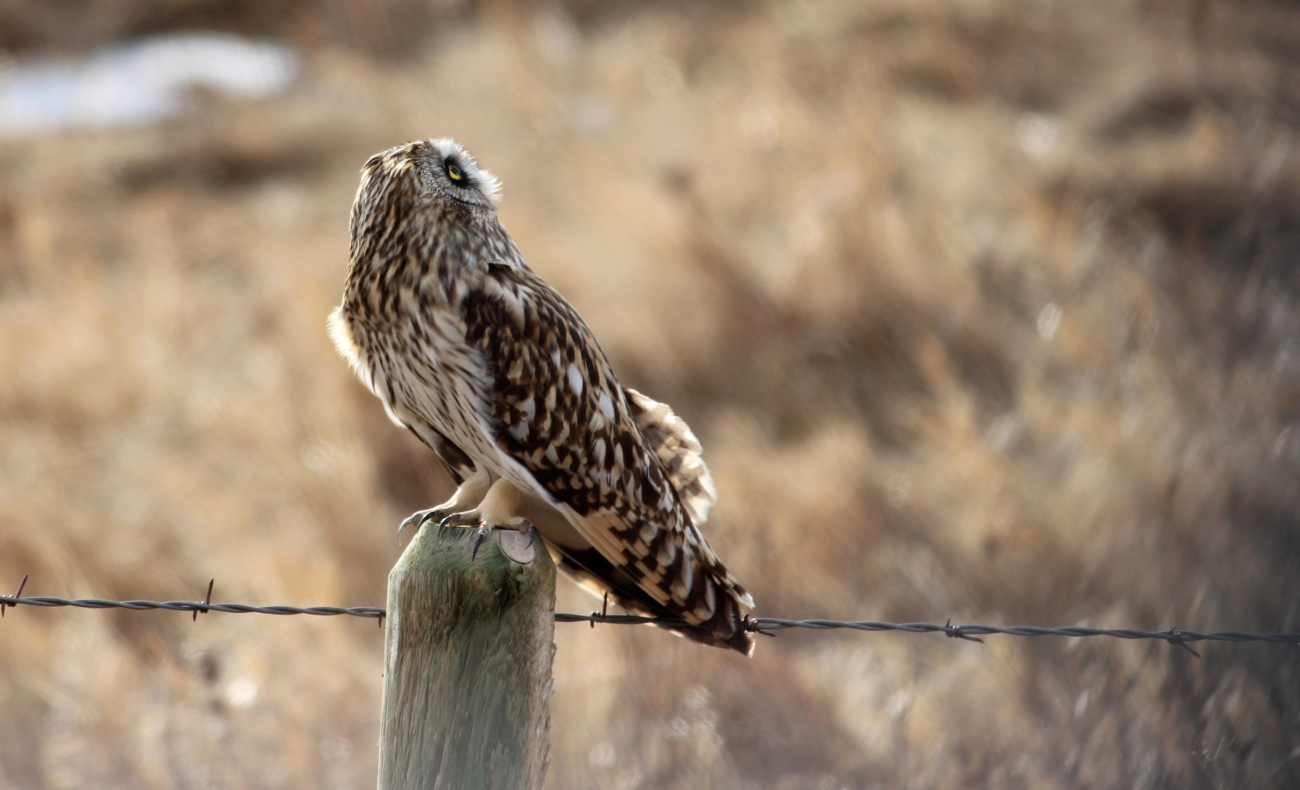 Turning heads. The Short-eared owl, a partially diurnal owl, can be seen hunting over open fields, meadows, and marshes. This female is perched on a fence in McIntosh County, ND. Suprisingly, this owl nests on the ground in grasslands. Unfortunately, its numbers are in declude due to loss of habitat and grassland conversion.