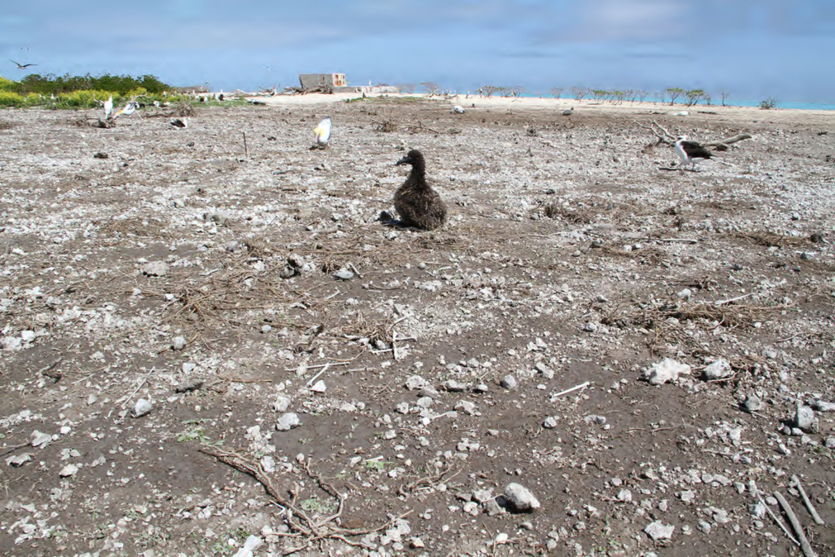 Short-tailed albatross chick in washed over area of Eastern Island after a tsunami generated by a powerful earthquake off the coast of Japan struck the refuge at 11:36 PM on Thursday, March 10th and continued for the next few hours. On March 15, FWS released an official announcement stating that surveys of the three islands reveal that more than 110,000 albatross chicks – about 22% of this year’s albatross production – were lost as a result of the tsunami and two severe winter storms that hit in January and February. At least 2,000 adults also died. The Short-tailed albatross nest was washed over again due to the tsunami, but the chick was found unharmed about 35 meters away and carried back to its nest cup.