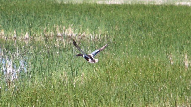 A drake shoveler takes flight across a cattail marsh at Grass Lake National Wildlife Refuge, located within the Charles M. Russell Wetland Management District. Grass lake Refuge is a hotspot for many bird species seeking refugia here. Photo by Cortez Rohr/USFWS.