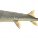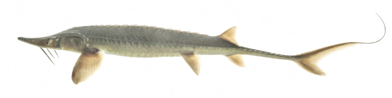 The shovelnose sturgeon is smallest of the ancient sturgeon species in North America and is similar in appearance to pallid sturgeon. It has a flat, shovel shaped snout and has pale, bony plates and large barbels next to its mouth.