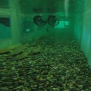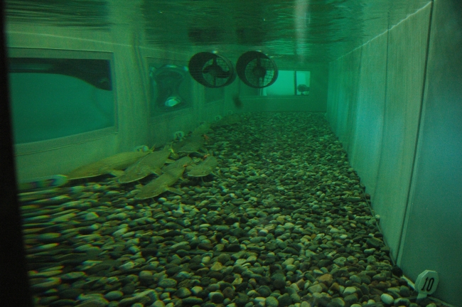 Shovelnose Sturgeon swimming in the living stream housed at the Bozeman Fish Technology Center. Shovelnose Sturgeon can act as a surrogate species for the endangered Pallid Sturgeon.