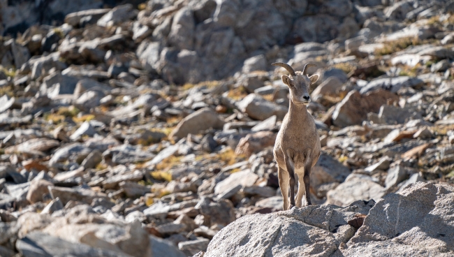 Sierra Nevada Bighorn sheep are federally listed as endangered. This subspecies of bighorn sheep has a historical range in the Sierra Nevada mountains from Sonora Pass in the north, to Olancha Peak in the south. These bighorn sheep live in elevations that range from 4,000-14,000 feet and have adapted to live in harsh mountain conditions. Predation, environmental factors, as well as concern of disease transmission from domestic sheep pose challenges to species recovery. Credit: Nathan Hurner/USFWS