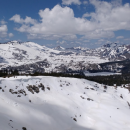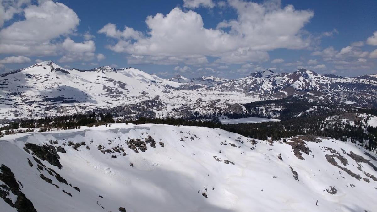 A snowy landscape is seen from the top of Ralston Peak looking across the high Sierra Nevada range in California.