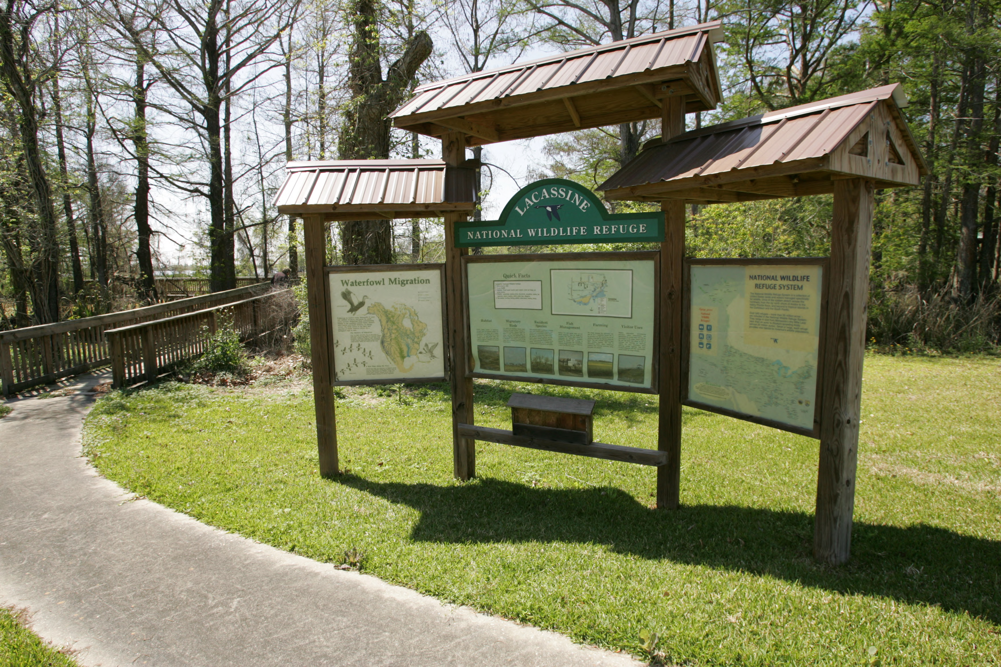 Lacassine NWR, in Cameron and Evangeline Parishes in southwestern Louisiana, was established on 12/30/37 by Executive Order No. 7780 as "a refuge and breeding ground for migratory birds and other wildlife." The refuge is nearly 35,000 acres in size, including 653 acres leased from the Cameron Parish School Board. The vegetation types occurring on the refuge are primarily water tolerant grasses, sedges, and shrubs. Vegetation in the undeveloped marshes is dominated by bulltongue and maidencane. The habitat is divided into 16,500 acres of natural, freshwater marsh and open water, 16,000 acres of managed, freshwater marsh (Lacassine Pool), 2,200 acres of rice, wheat, soybean, and natural moist soil fields, 350 acres of flooded gum and cypress trees, and 350 acres of restored tallgrass prairie. Wildlife species found on the refuge are those indigenous to the marshes of coastal Louisiana.