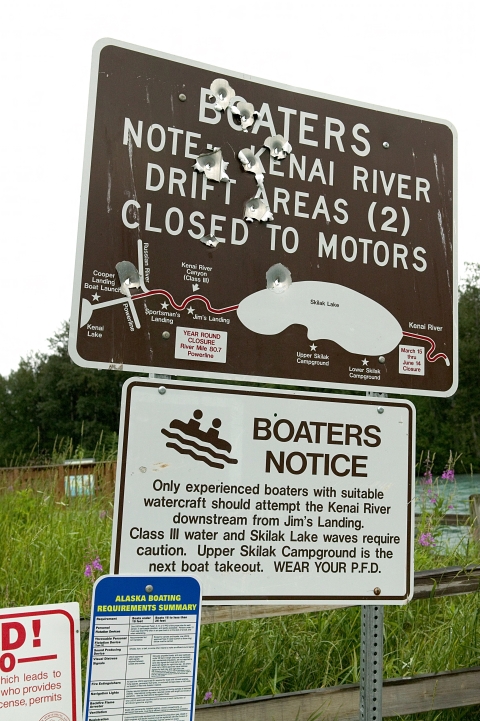Signs showing regulations for boating on Kenai River in Alaska. Alaska is a land of awe-inspiring beauty and fish and wildlife spectacles, and the Kenai National Wildlife Refuge is a microcosm of all this wonderful state has to offer.
