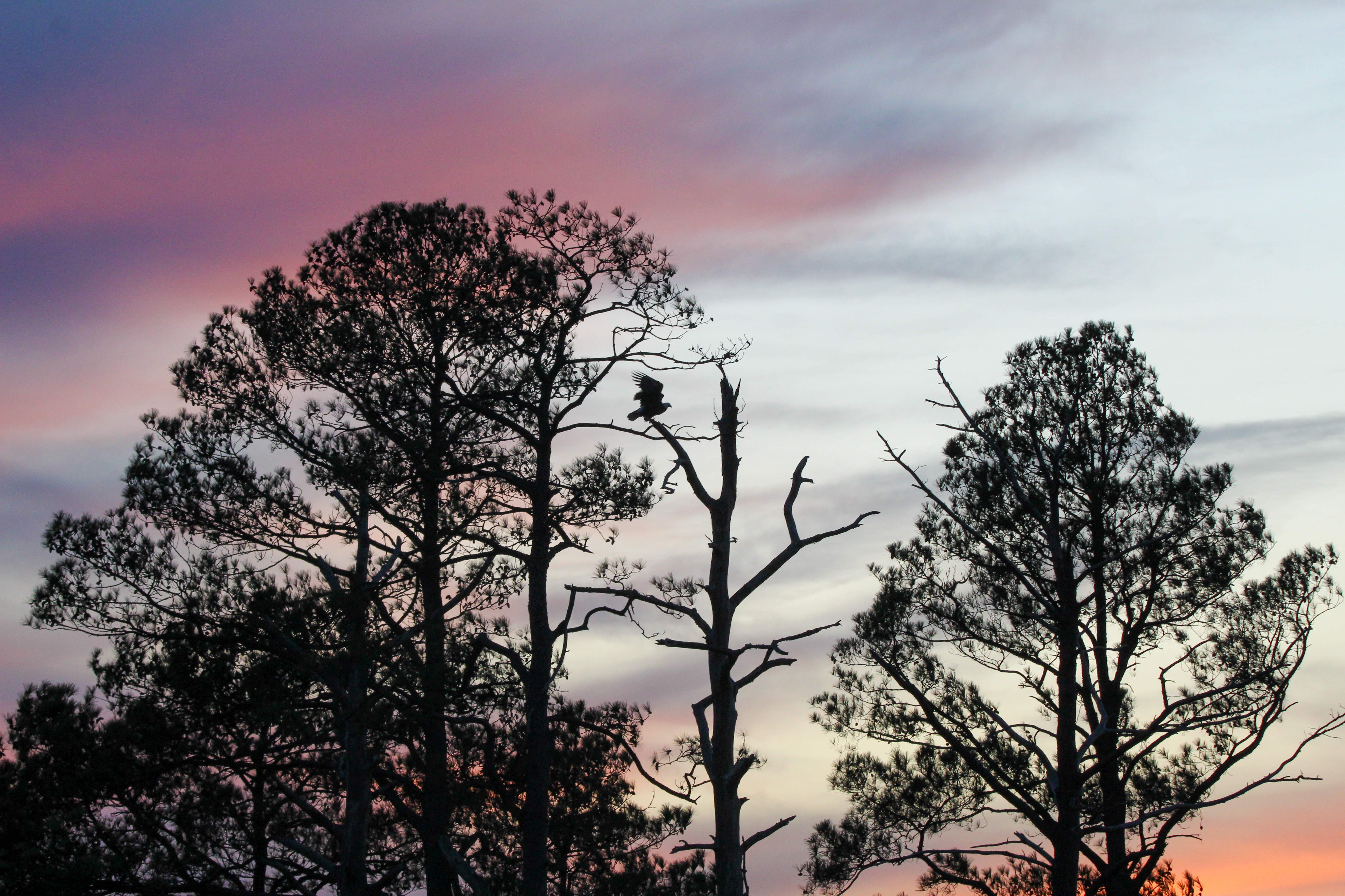 Silhouette of eagle perched on tree branch against night sky at Blackwater National Wildlife Refuge.