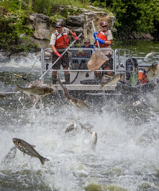 U.S. Fish and Wildlife Service personnel net Silver carp jumping in the Fox River.