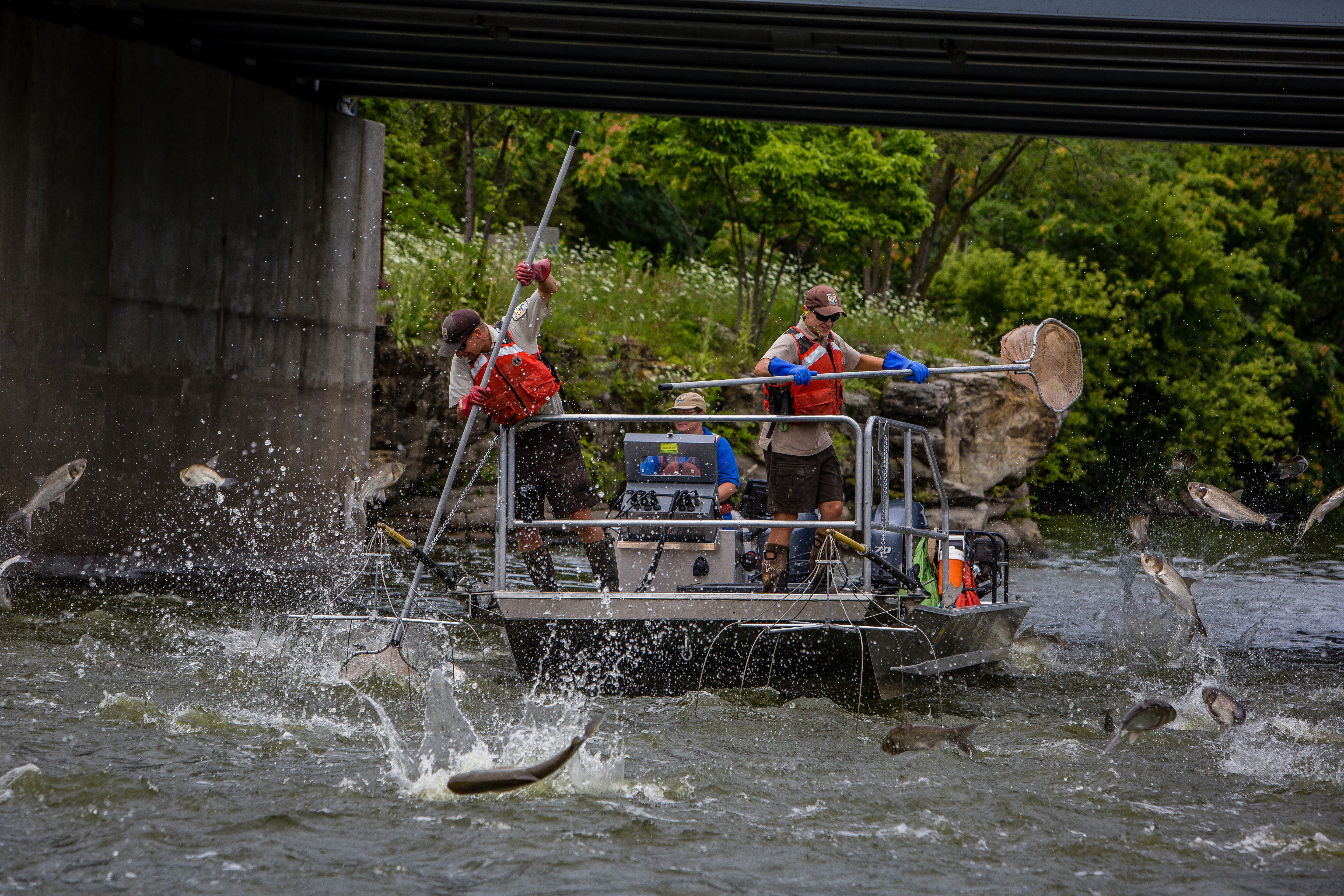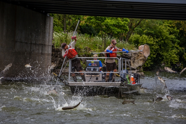 U.S. Fish and Wildlife Service personnel net Silver carp jumping in the Fox River.