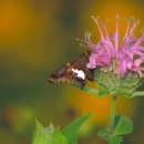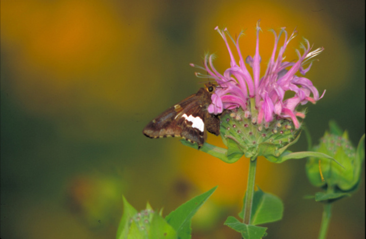 Brown butterfly with white patch o wing, sitting on pink blossom, viewed from side.