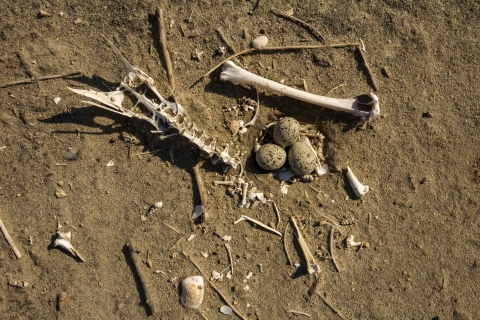 Skeletal remains near eggs at San Diego Bay National Wildlife Refuge, California.