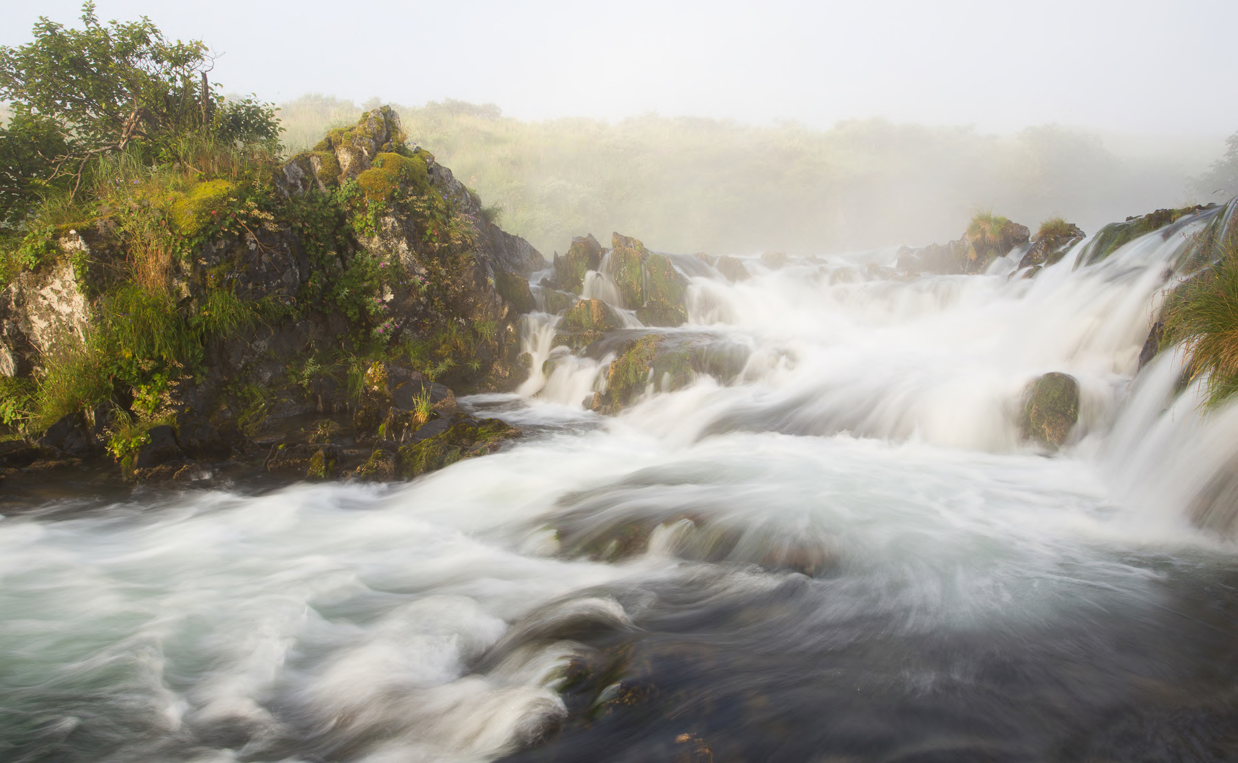 A small cascade begins the Dog Salmon Falls, a 30 foot waterfall just below Frazer Lake. The Alaska Department of Fish and Game built a fish ladder and introduced sockeye salmon to the river and lake in the 1950s. Returning sockeye school at the base of the falls before migrating up the ladder; bears congregate in the area to take advantage of the fishing opportunity.