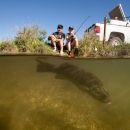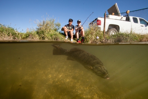 Underwater half submerged photography of teens fishing and a visible Smallmouth bass below the water line.