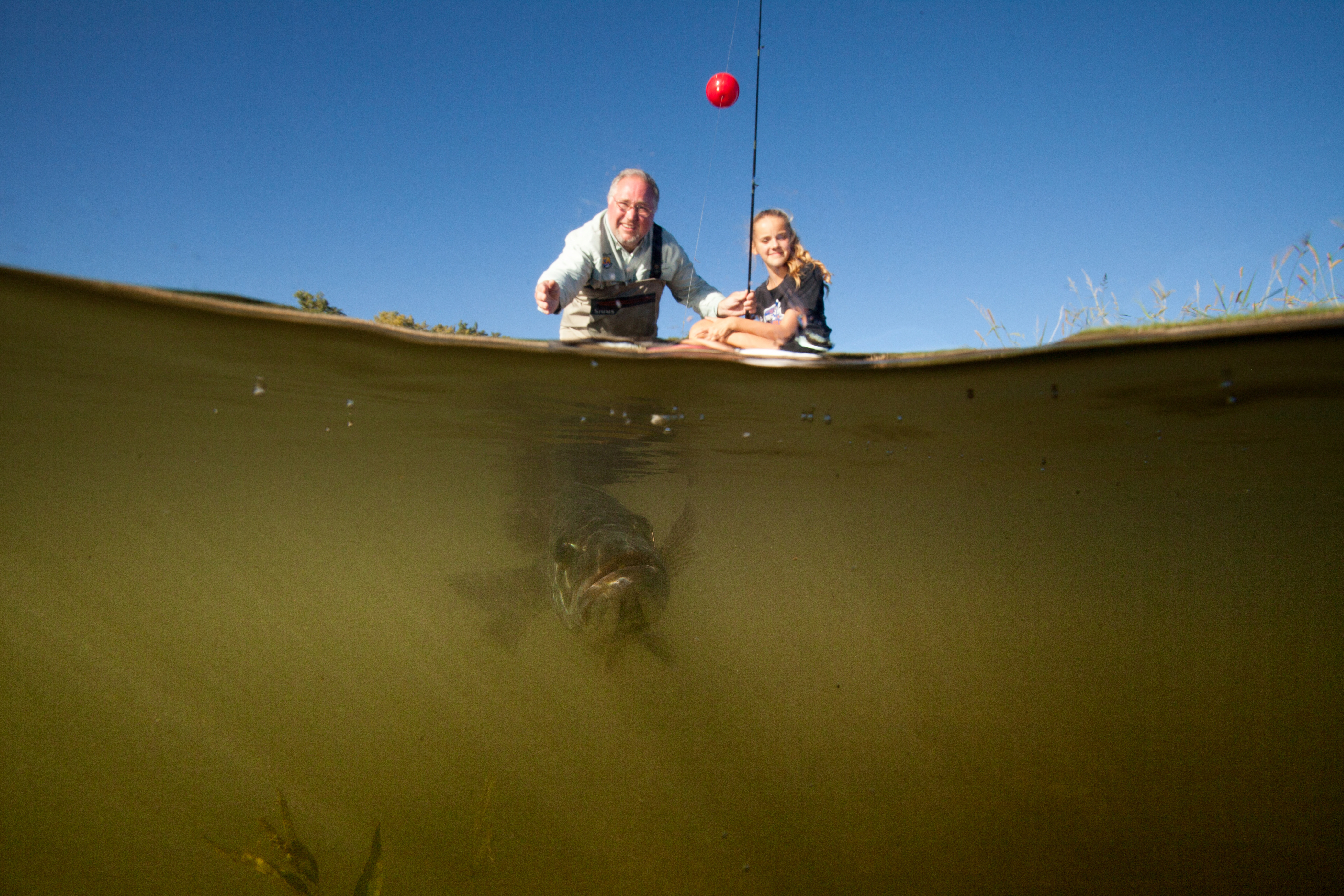 Underwater split shot of a man and girl fishing and a visible Smallmouth bass below the water line.