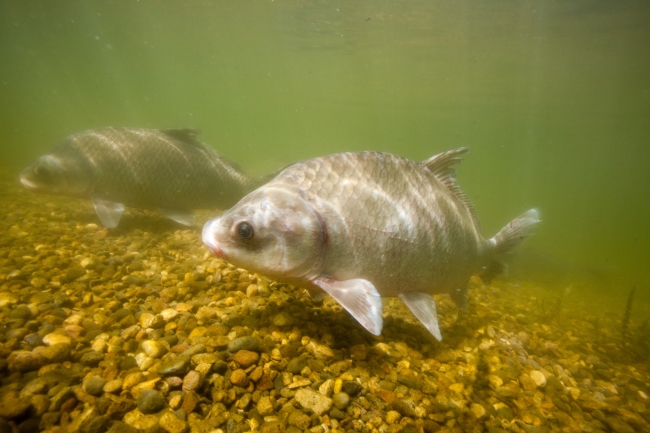 The mouth of the Smallmouth buffalo is fleshy and projects downward, like most suckers. Smallmouth buffalo feed on the bottom, and eat mainly insect larvae and crustaceans.