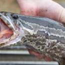 A northern snakehead close up with mouth open, highlighting its teeth.