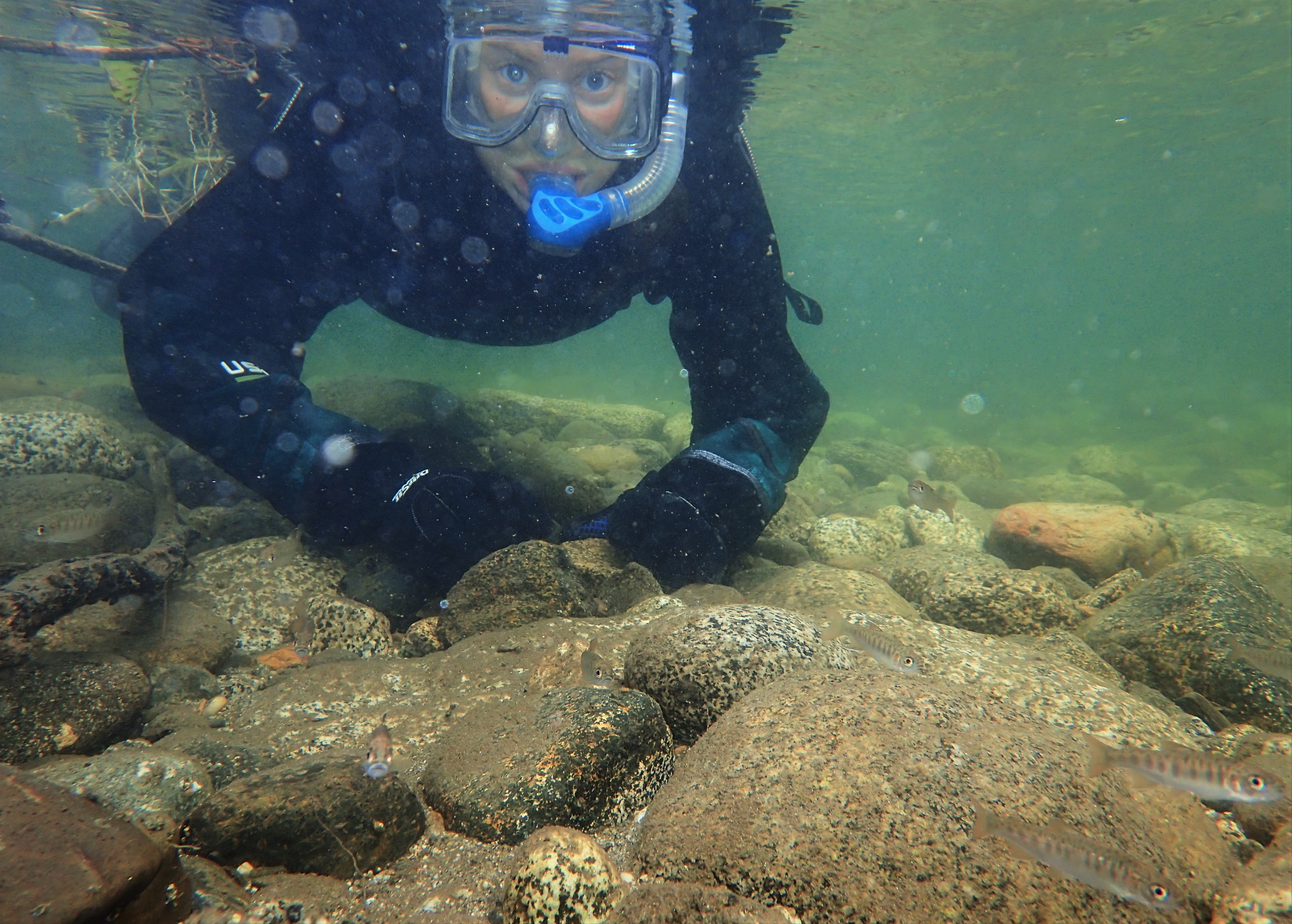 Mid-Columbia Fish and Wildlife Conservation Office staff snorkel in Icicle Creek to monitor native salmon and trout populations.
