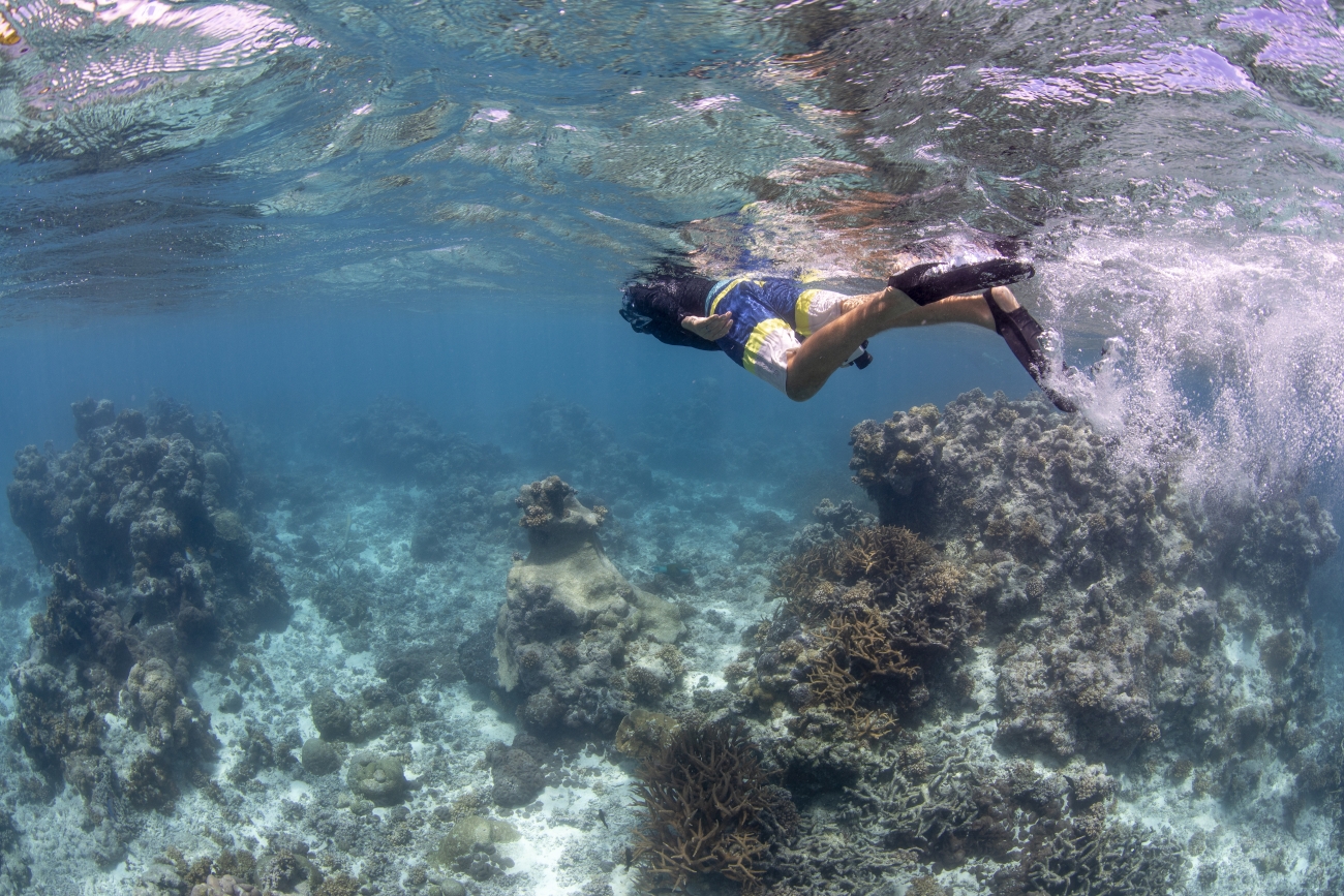 Snorkeler searching for crown-of thorns starfish. Starfish preys upon hard, or stony, coral polyps. One of largest starfish in the world.