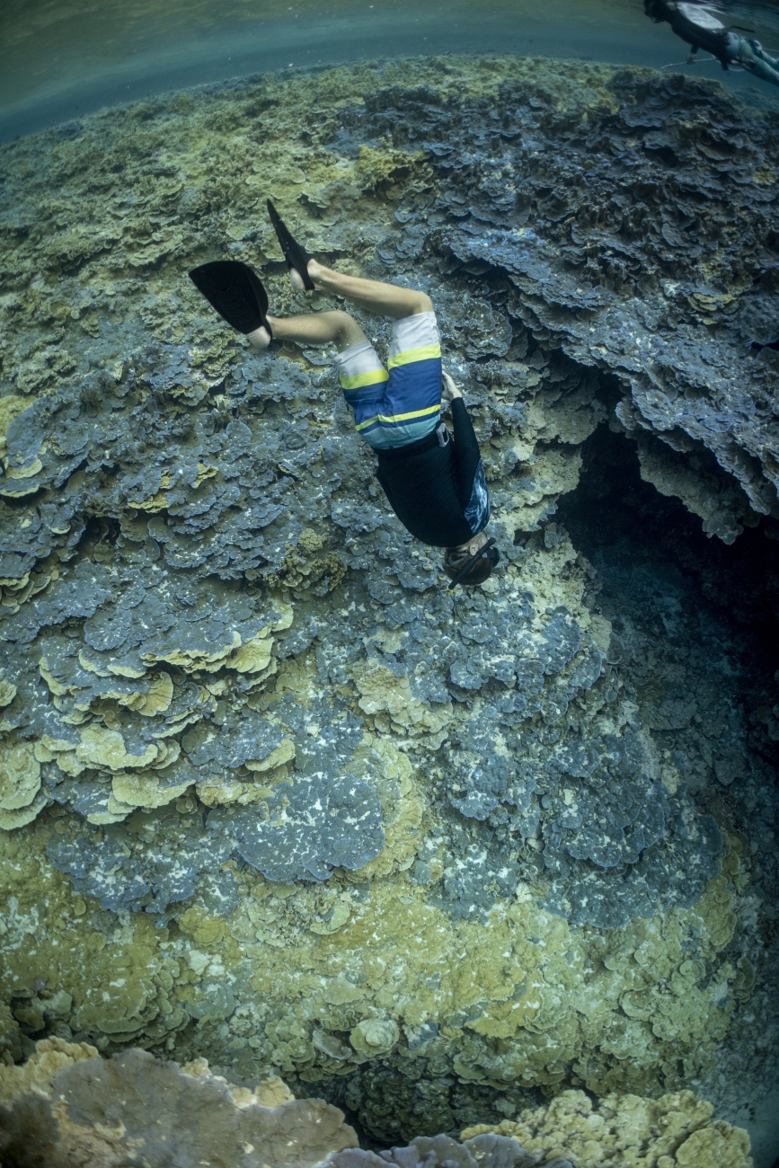 Snorkeler surveying reef for crown-of-thorns starfish.
