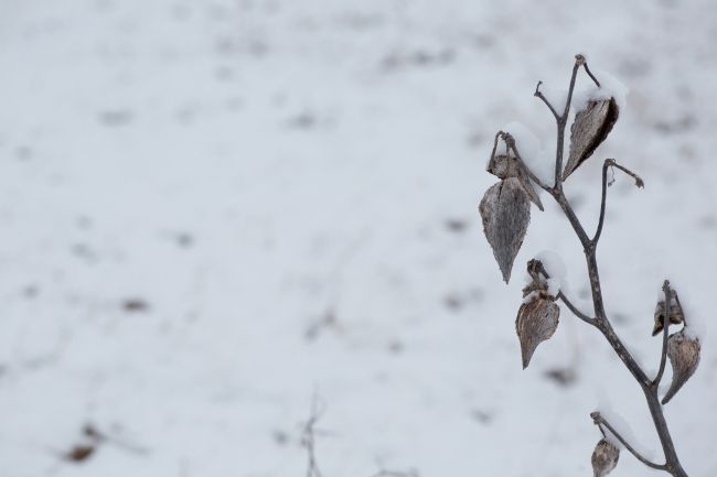 Snow on common milkweed