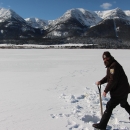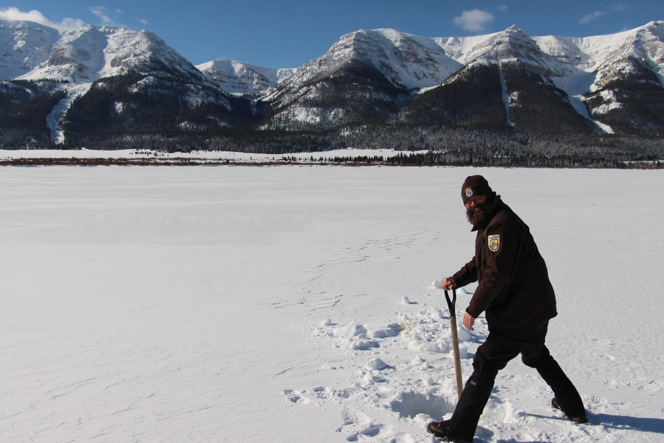 Deputy Refuge Manager Cortez Rohr (2019-2023) digs through snow to reach the ice on Upper Red Rock Lake at Red Rock Lakes National Wildlife Refuge in preparation for augering a hole to monitor oxygen levels in support of Arctic grayling conservation efforts. Photo by Cortez Rohr/USFWS.