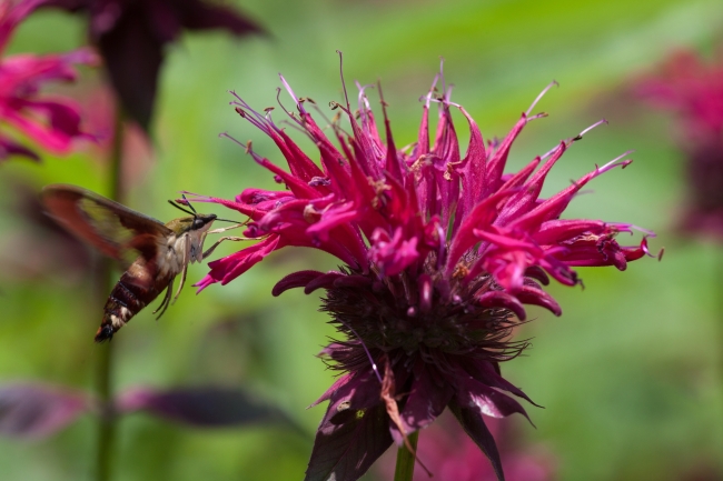 Snowberry clearwing, also know as Hummingbird moth, feeds on Monarda
