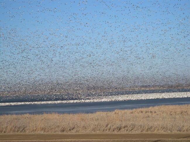 A large flock of snow geese arrive at Tewaukon National Wildlife Refuge during their northward spring migration.