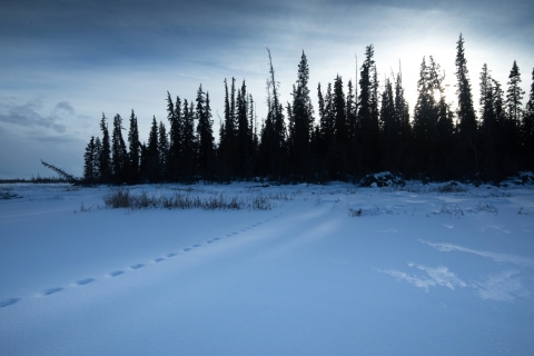 Snowshoe hare tracks in the snow. Lynx prey mostly on hare, and are tied to their population growth and crashes. Lynx Project At Yukon Flats National Wildlife Refuge.