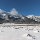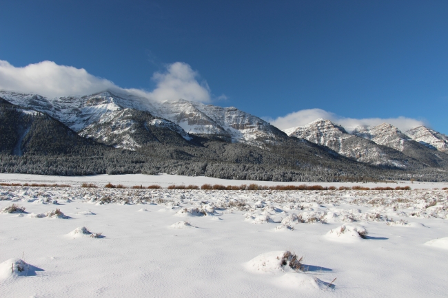 A snowy Centennial Mountain range under vivid blue skies with some wispy white clouds dazzles the background of the landscape at Red Rock Lakes National Wildlife Refuge. Photo by Cortez Rohr/USFWS.