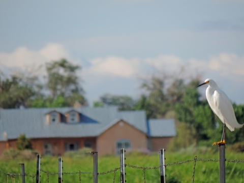 A Snowy egret is perched on a fence at the refuge.