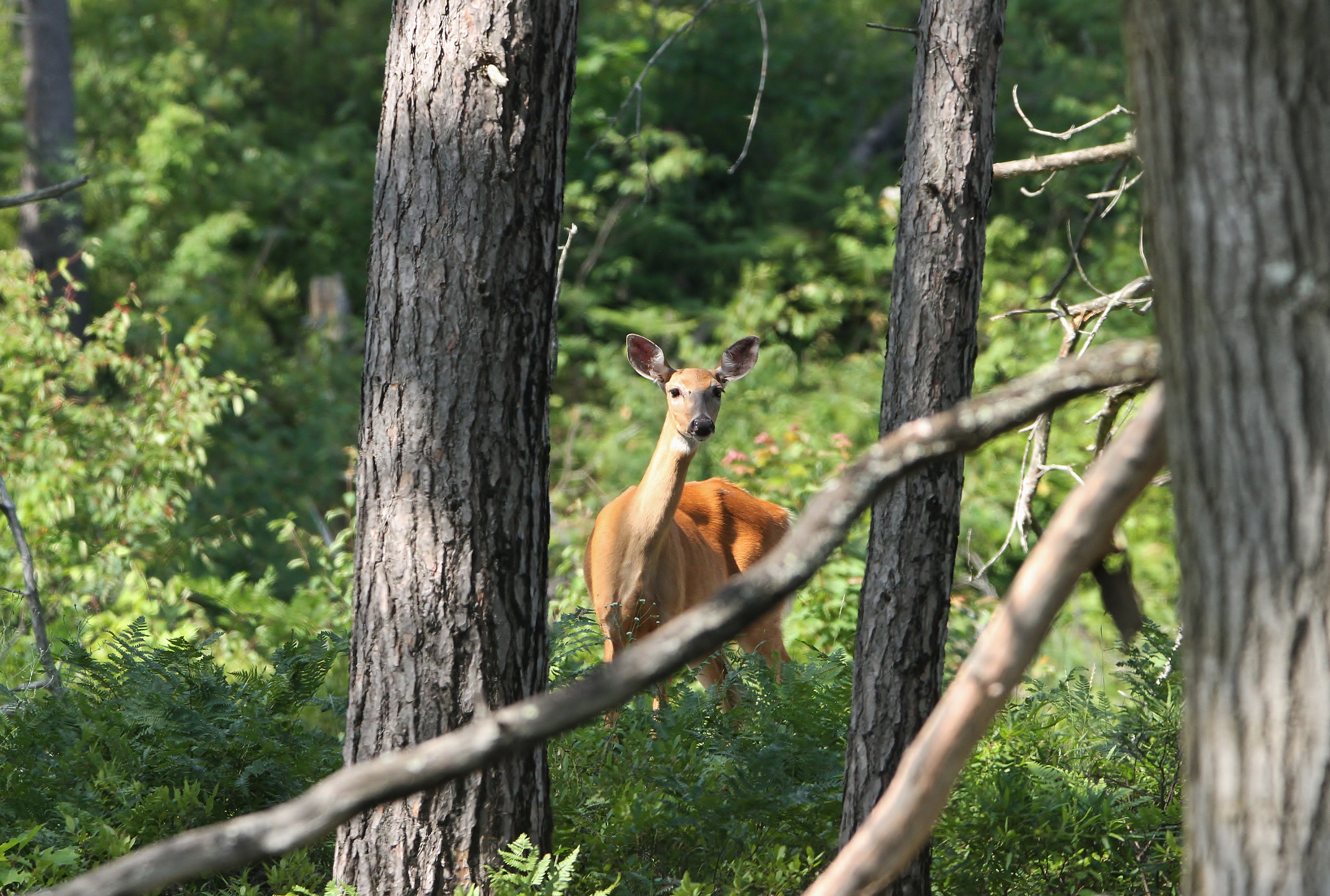 White-tailed deer peering through the trees courtesy of Teresa McGill.